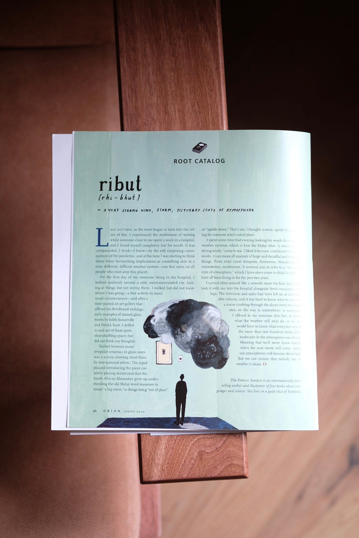 This week I returned from a walk to find the spring issue of Orion waiting for me on the doorstep, which contains the second instalment of my ‘Root Catalog’ column (below, readable in full except for the unavoidable slice of bright sunlight on the right edge). This issue, which explores ‘life and death in the wilderness of the hospital’ is a remarkable collection of feeling, questions, and humanity, and I’m certain I will be returning to reread the essays with some frequency.