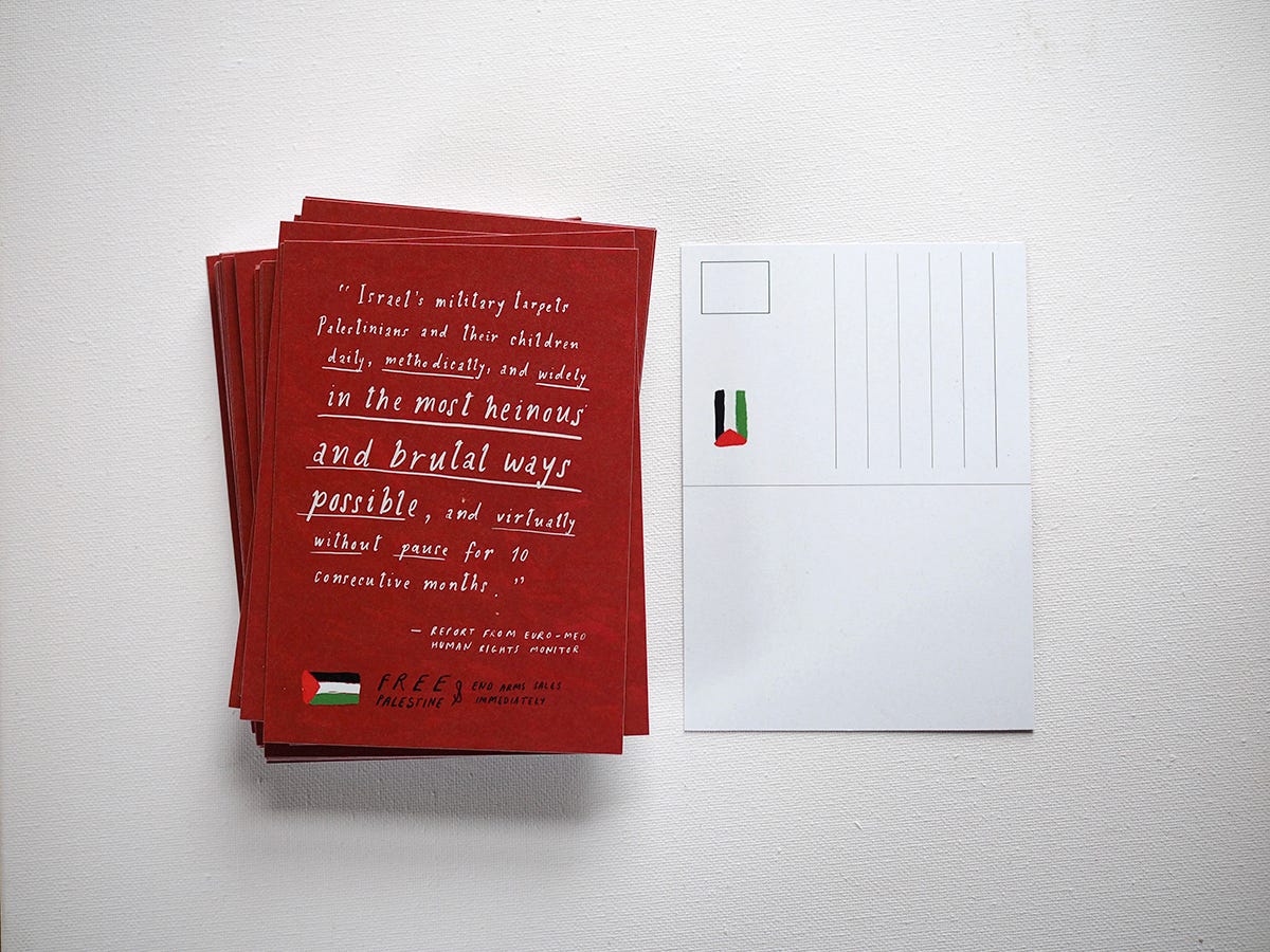 For the cost of a stamp, purchase a postcard to someone or somewhere demanding sanctions, an end to arms sales, recognition of war crimes, an end to occupation and the brutal, indiscriminate massacre of Palestinians on their ancestral and native lands. There is an added option of including a recipient and a note, which I will then personally transcribe before sending: