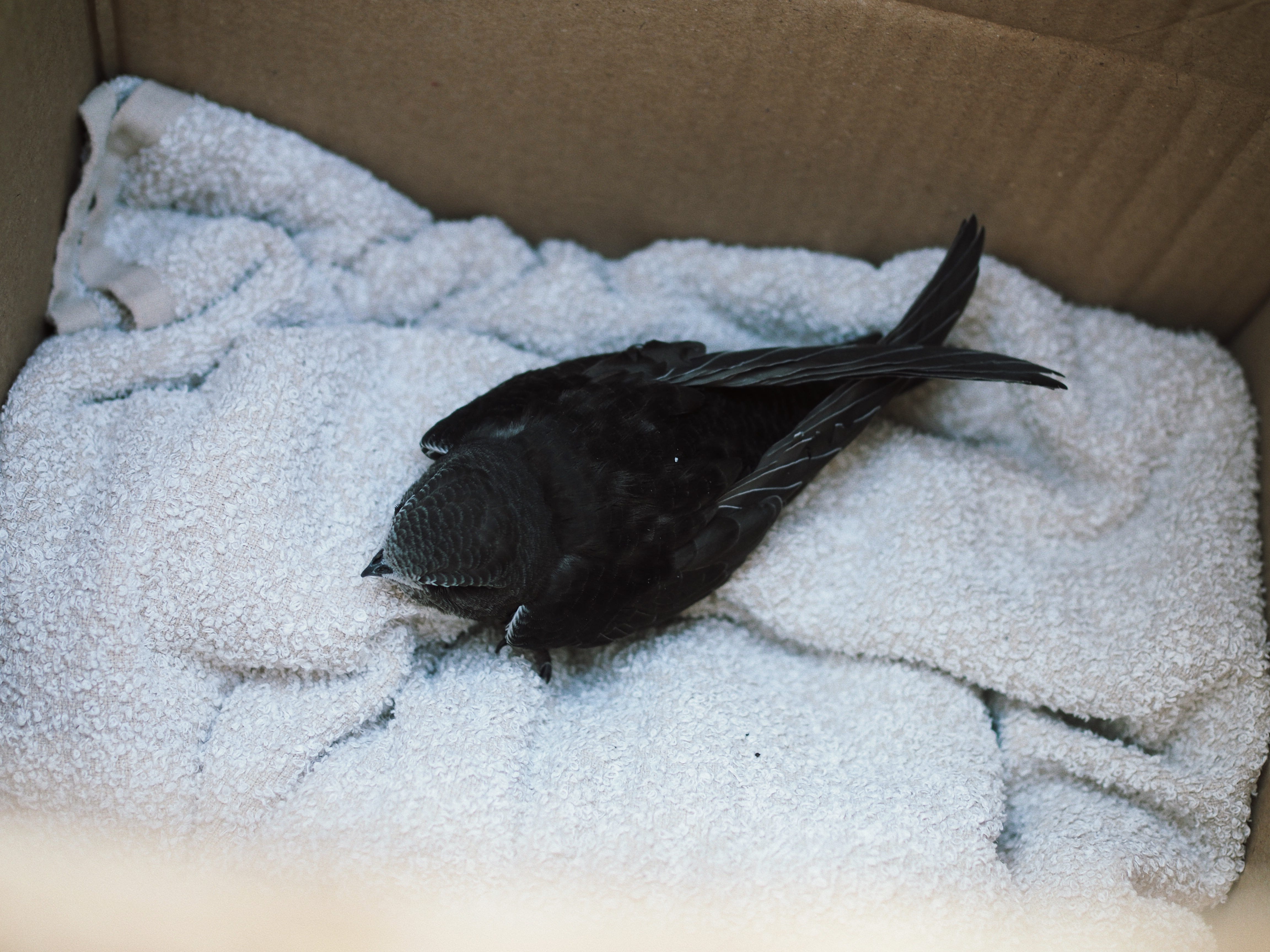 Then any and all thoughts of rottenness forgotten one morning when you find a young swift flailing about at the edge of the road and getting noticed by dogs. It clearly hadn’t fledged and so perhaps fell out of the high nest due to heat or hunger but seemed intact and uninjured so it sat content-alert in a cardboard box with a towel with us while we ate breakfast—you had been on the way to purchase yoghurt when you found it and you said upon your no-yoghurt return this might be the most beautiful thing I’ve ever seen—and then a message to a local wildlife expert confirmed the preferred course of action as if you can get it back in the nest then do that.