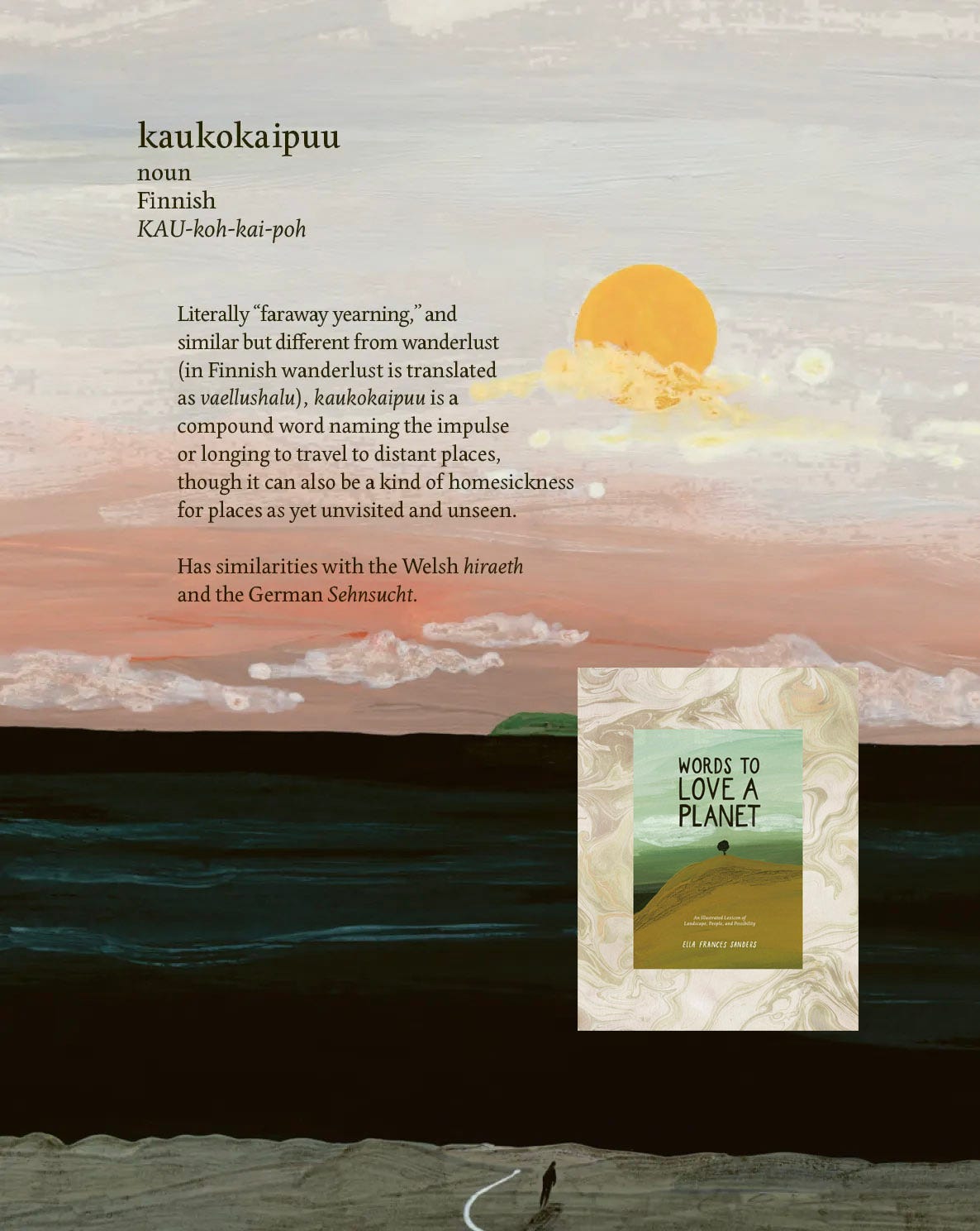More harping, not least because Words to Love a Planet is out, in the US, in only 10 days. And now through until 12am CST on April 7th, as a small gift, anyone who either has already pre-ordered the US edition or does now pre-order the US edition can receive, in two different colourways, a high resolution file of one of the paintings in the book. (You’ll find this painting on page 220, towards the end, accompanying the Finnish word kaukokaipuu.)
